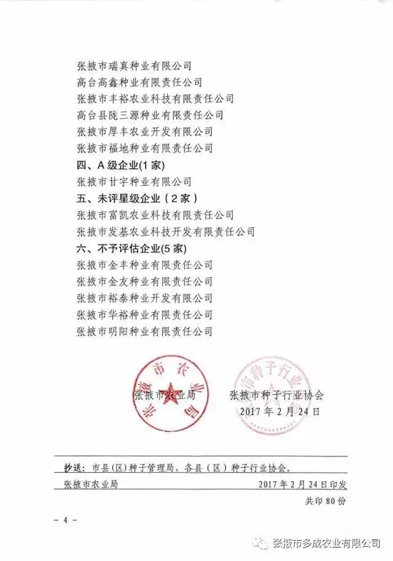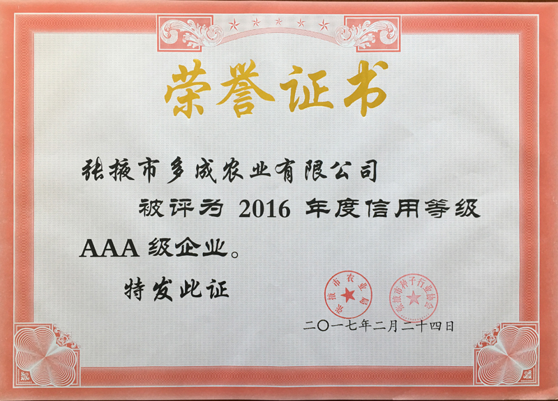 | 熱烈祝賀張掖市多成農(nóng)業(yè)有限公司被評(píng)為2017年度信用等級(jí)AAA級(jí)企業(yè)! | ||