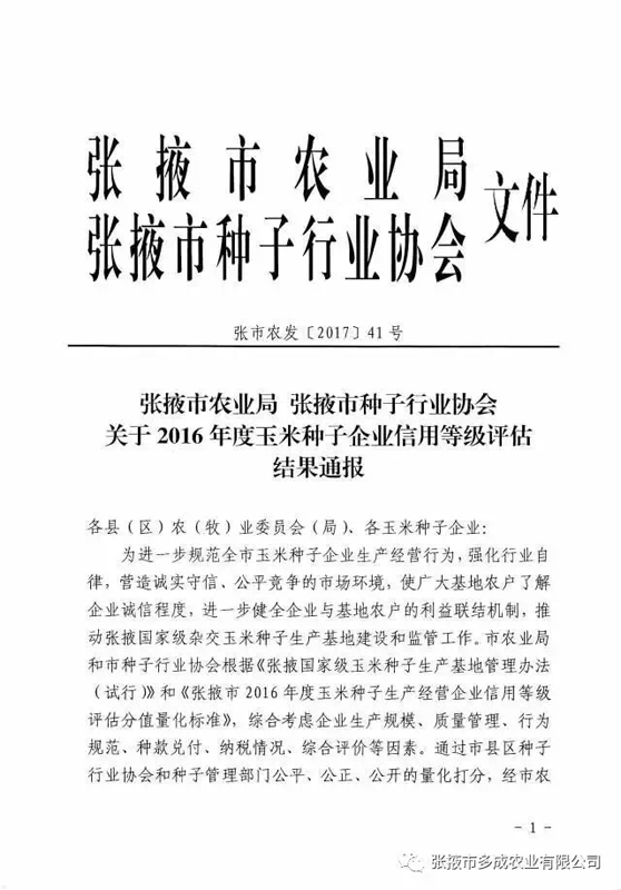 熱烈祝賀張掖市多成農(nóng)業(yè)有限公司被評(píng)為2017年度信用等級(jí)AAA級(jí)企業(yè)。 2017年2月24日,張掖市農(nóng)業(yè)局、張掖市種子行業(yè)協(xié)會(huì)公布的《2016年度玉米種子企業(yè)信用等級(jí)評(píng)估結(jié)果》中,張掖市多成農(nóng)業(yè)有限公司被評(píng)為2016年度信用等級(jí)AAA級(jí)企業(yè)。 |
