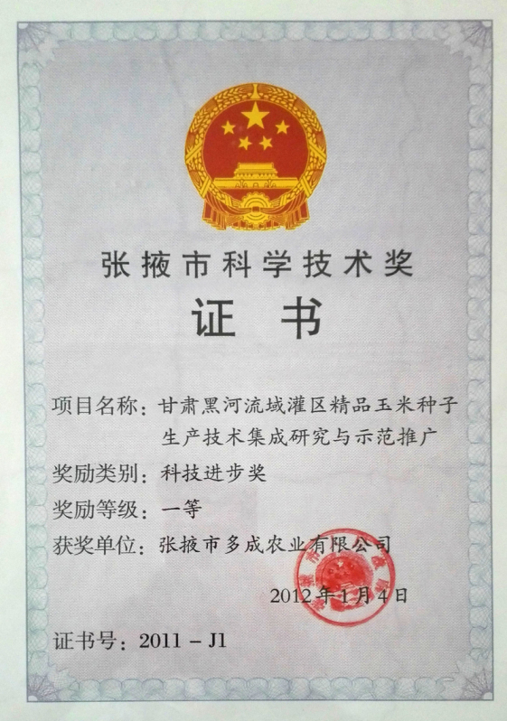 黑河流域精品玉米種子生產(chǎn)技術(shù)集成研究推廣科技進(jìn)步一等獎